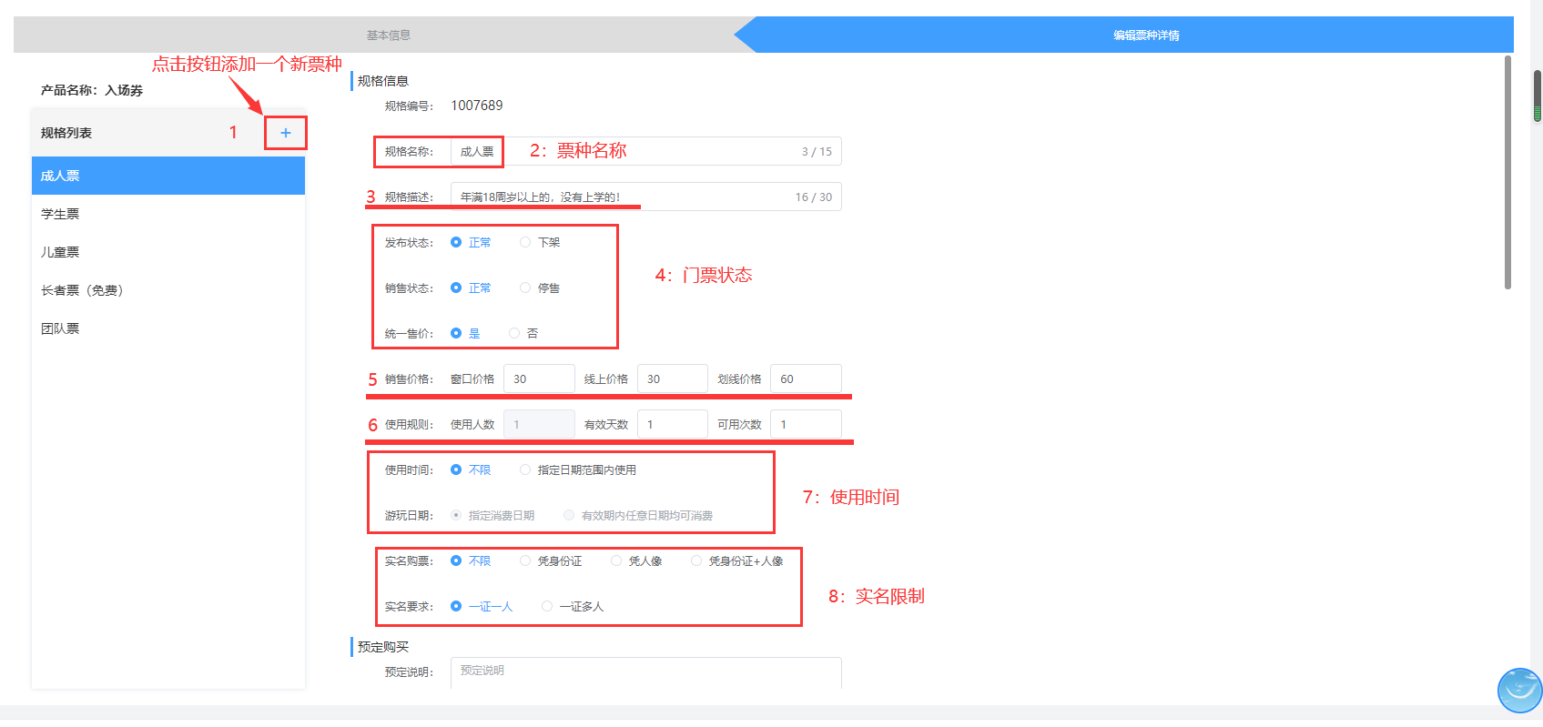 6:使用规则-普通门票只能供一人使用,使用天数(从购买日期往后延伸1代表当天),可用次数(可以核销的次数)。