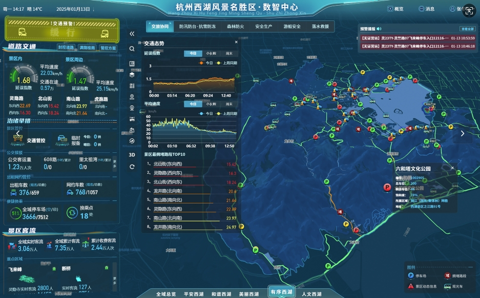技术提供方浙江大华技术股份有限公司有关负责人介绍,方案以“智能算力中心、物联感知中心、视频调度中心、事件运行中心、时空地理信息中心”为能力支撑,通过全量多模态数据要素归集、更新与融通,构建起覆盖全场景、全量数据、全智能的数智景区综合管控方案。在西湖断桥、北高峰等客流聚集地建设客流管控智能化平台,动态监测、分析客流实时变化趋势,并基于游客高峰预警适时触发应急预案,保障游客出行安全。