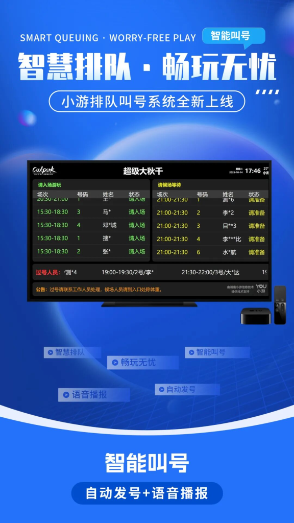 01.自动发号叫号,降低人工成本热门项目在繁忙时段可以达到几十个人同时等待体验,以往需要配备专人进行发号和叫号,维持现场排队秩序,不仅人力成本高,管理效率也有限。小游排队叫号系统自动发号与智能叫号,游客通过景区小程序提前预约,系统即可自动完成排队排序与叫号提醒,大幅减少现场工作人员压力,有效节约景区管理成本。